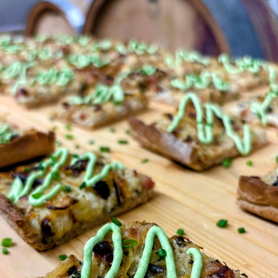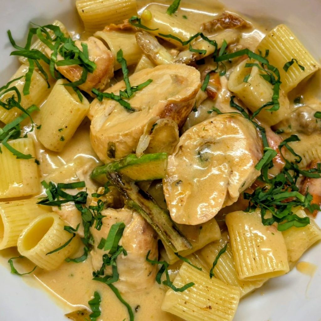 Wir starteten mit Zwiebelkuchen mit Bärlauchcreme – fränkisch mit Frühlingtouch. Dann eine Bärlauchsuppe mit Schwarzbrotcroutons. Der Hauptgang Involtini vom Huhn, Pasta und buntes Spargelgemüse. Dazu die passenden Weine – abgestimmt auf jeden Gang, wie’s sein soll. Und zum Schluss noch was fürs Herz: Quarkmousse mit Zitrussalat. Frisch, leicht, rund.
